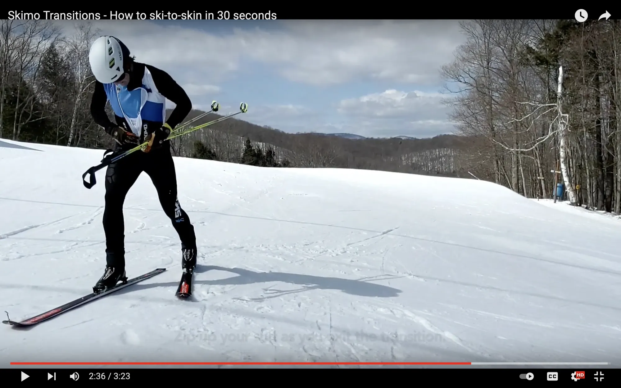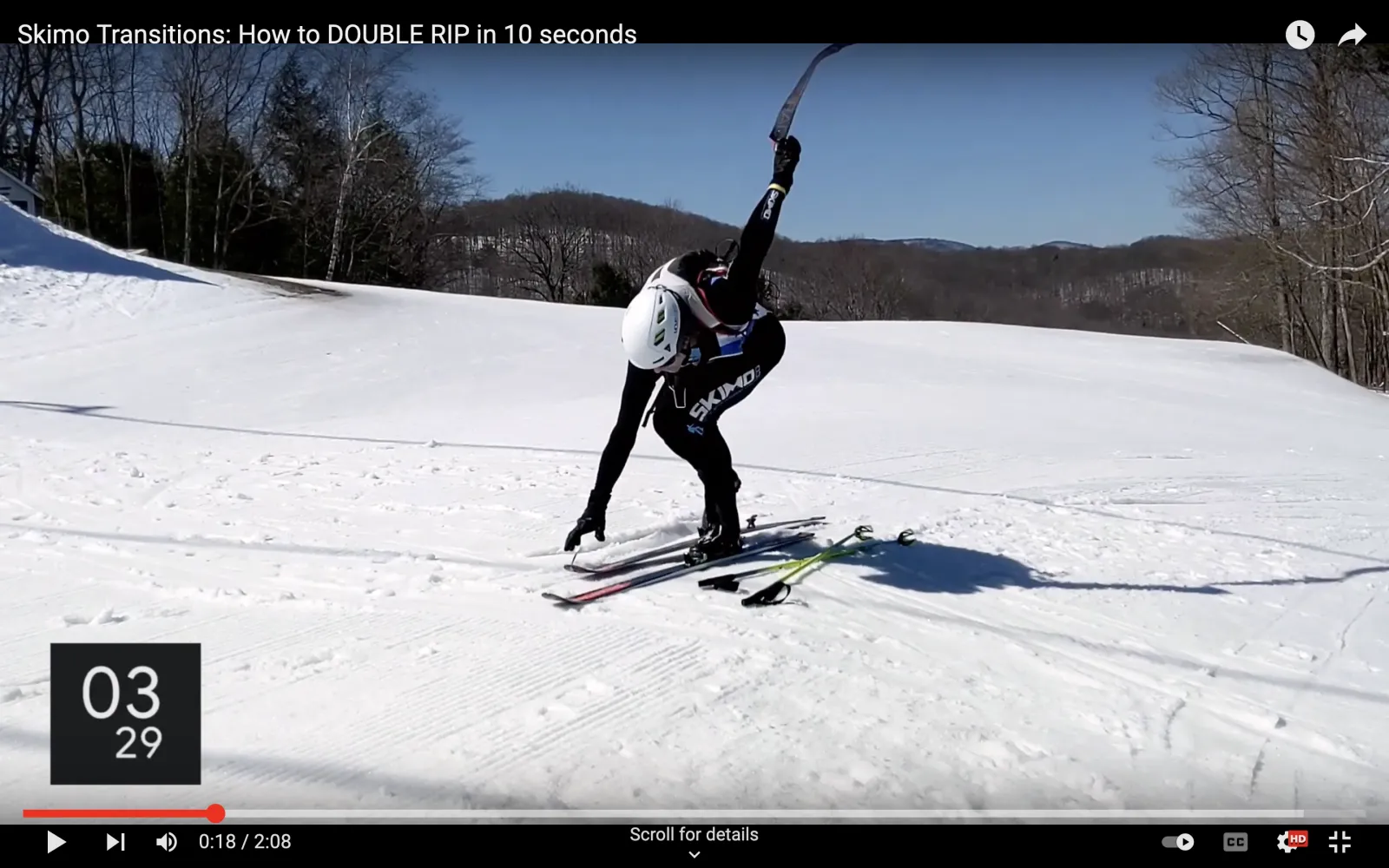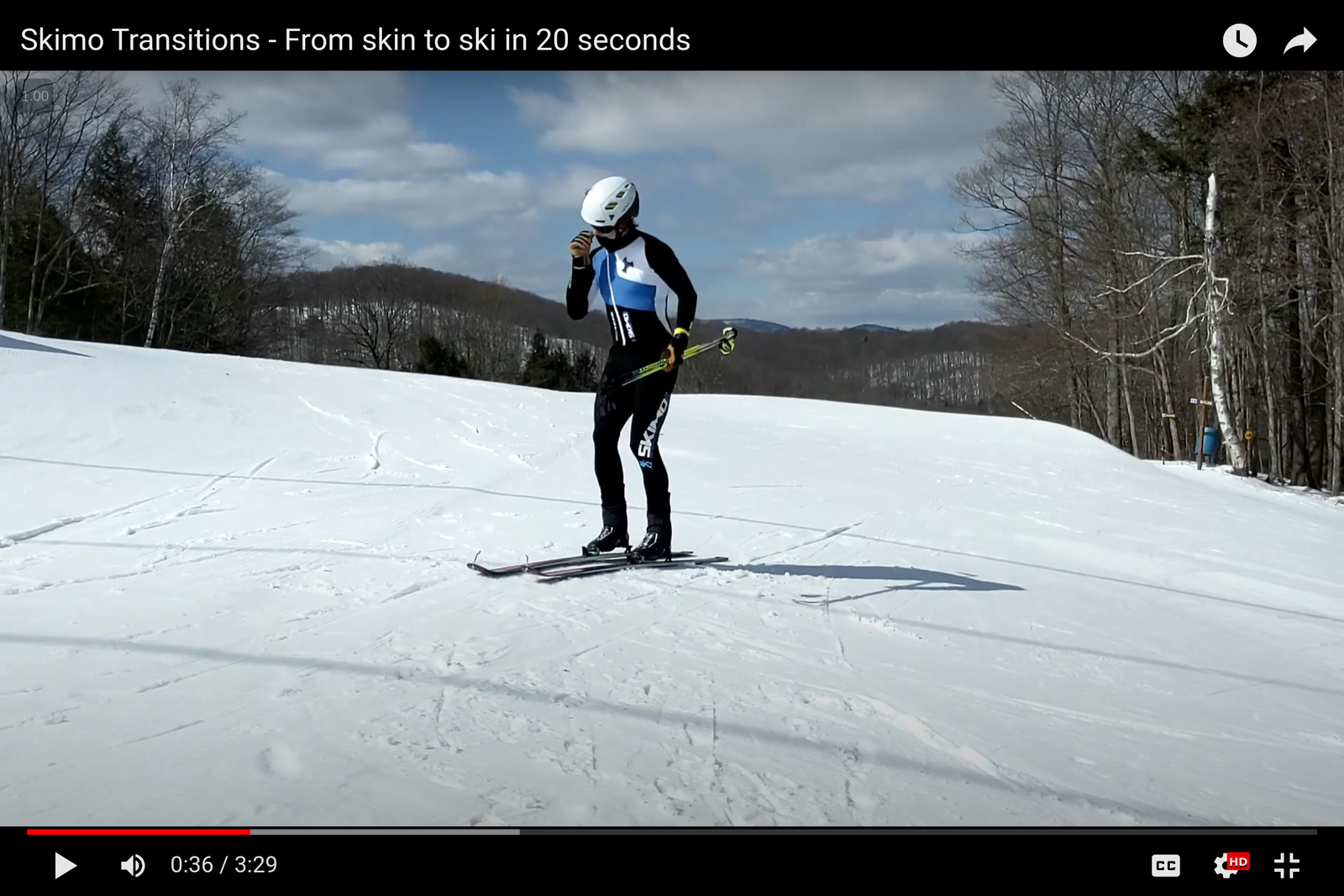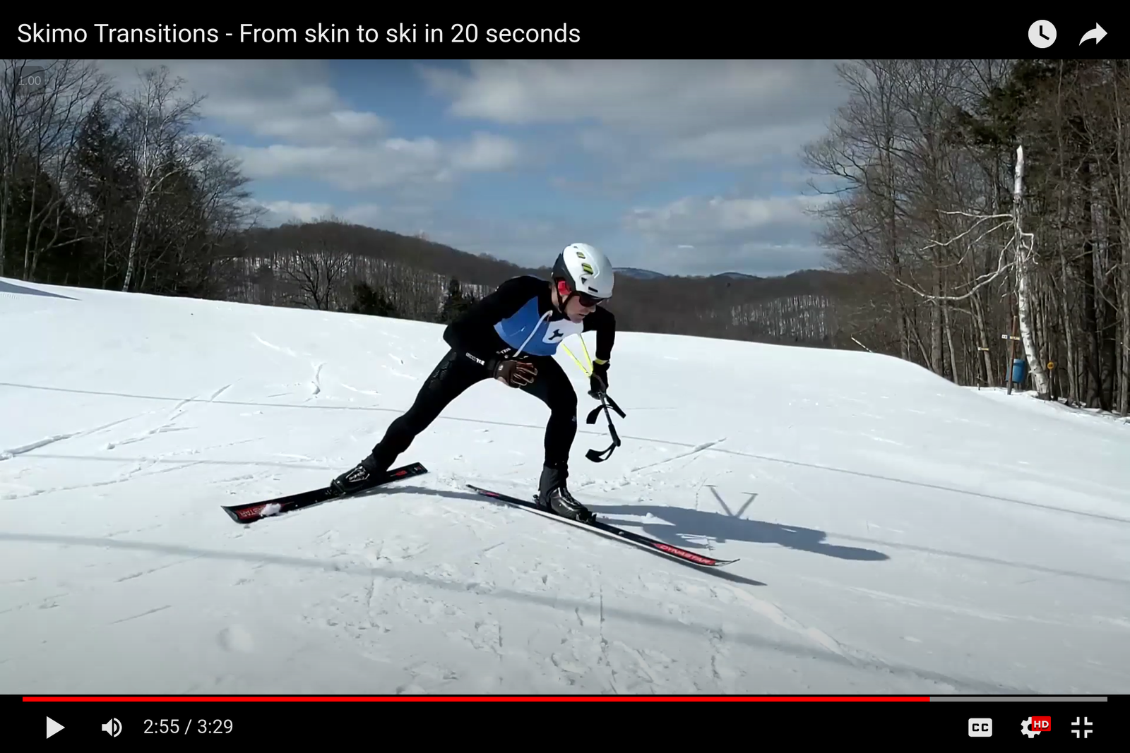 At the top of each climb, a skimo racer must switch from uphill skinning to downhill skiing and do it in less than 30 seconds to be competitive. Less than 20 seconds is ideal.